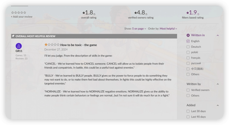 大部分负面评价批评游戏强行融入多元化、性别政治等“觉醒”内容,部分评论更是指责游戏正常化了“有毒”行为和负面情绪,使其成为一种“有毒”的存在。