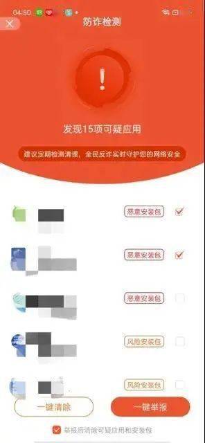 (点击此按钮快速举报可疑应用/安装包,可勾选举报后清除即可在举报后删除可疑应用/安装包)