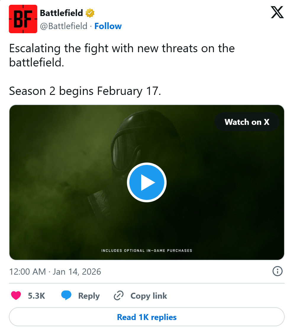 九游娱乐,九游娱乐官网,九游app,九游下载安卓,九游体育,九游,九游下载,九游体育娱乐,九游体育app,九游体育网页版,九游真人,九游棋牌,九游捕鱼,九游娱乐靠谱吗,九游体育官网,九游官网近日,Battlefield Studios正式确认,《战地6》第二赛季将推迟上线日结束的第一赛季,将延长约一个月,新的结束时间调整为2月17日,第二赛季也将于同日开启。官方表示,此次调整是为了确保新赛季内容达到预期品质。
