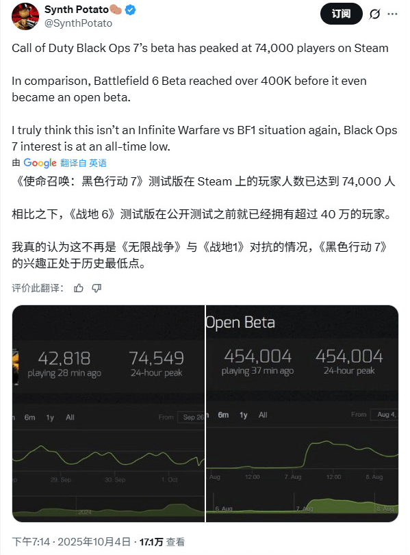 本作在 Steam 上开启 Beta 测试后,初期在线人数也非常低迷。虽然需要通过活动获取测试邀请码,但即便如此,《黑色行动7》的表现依然远逊同期的《战地6》。