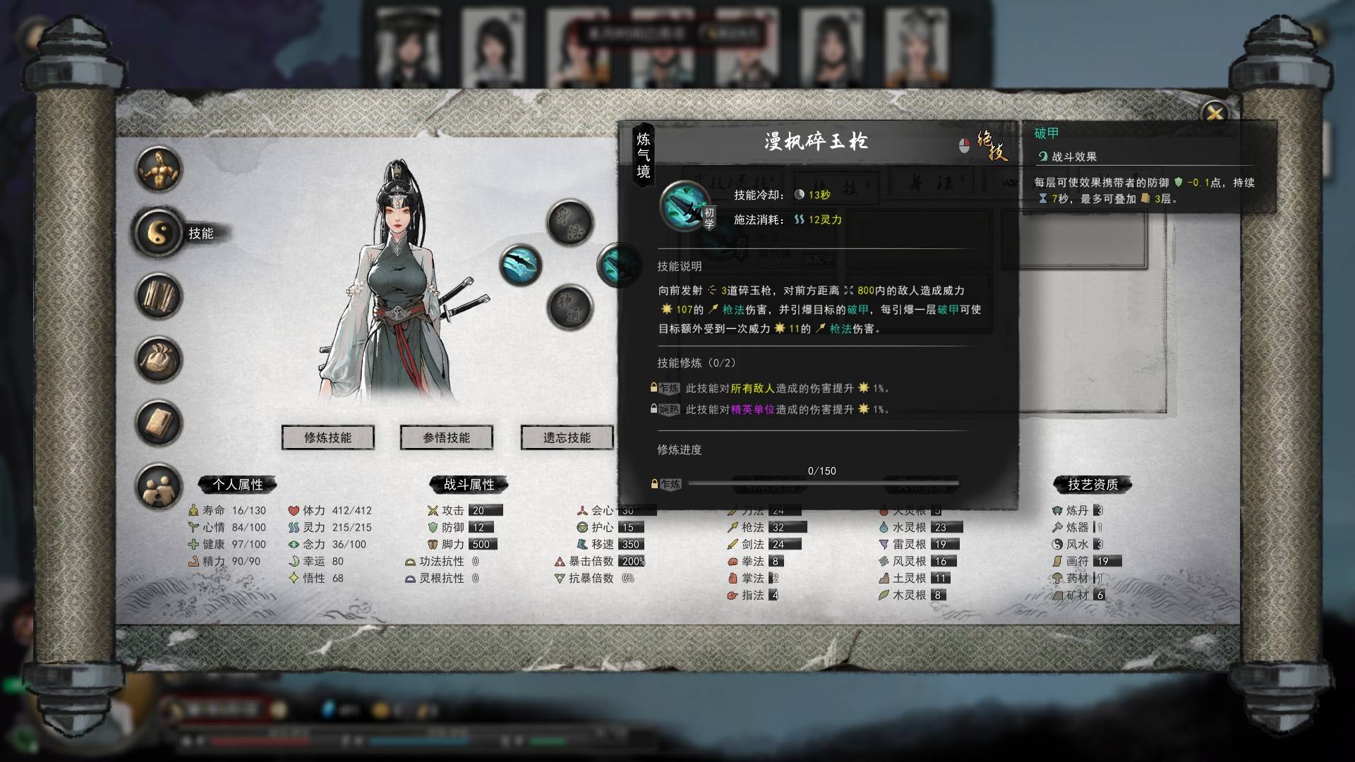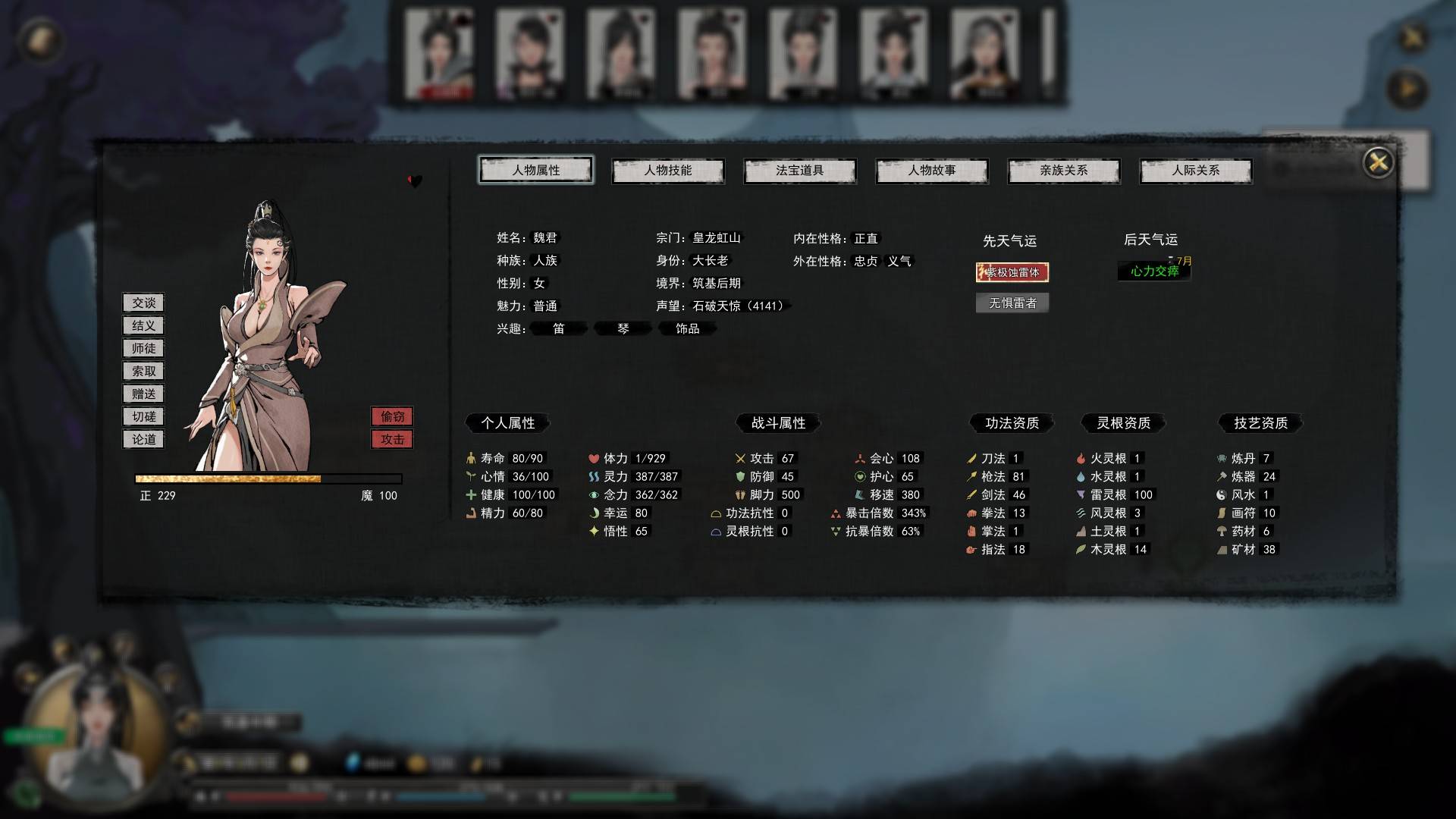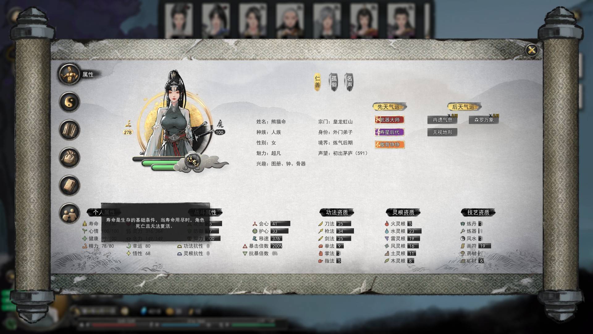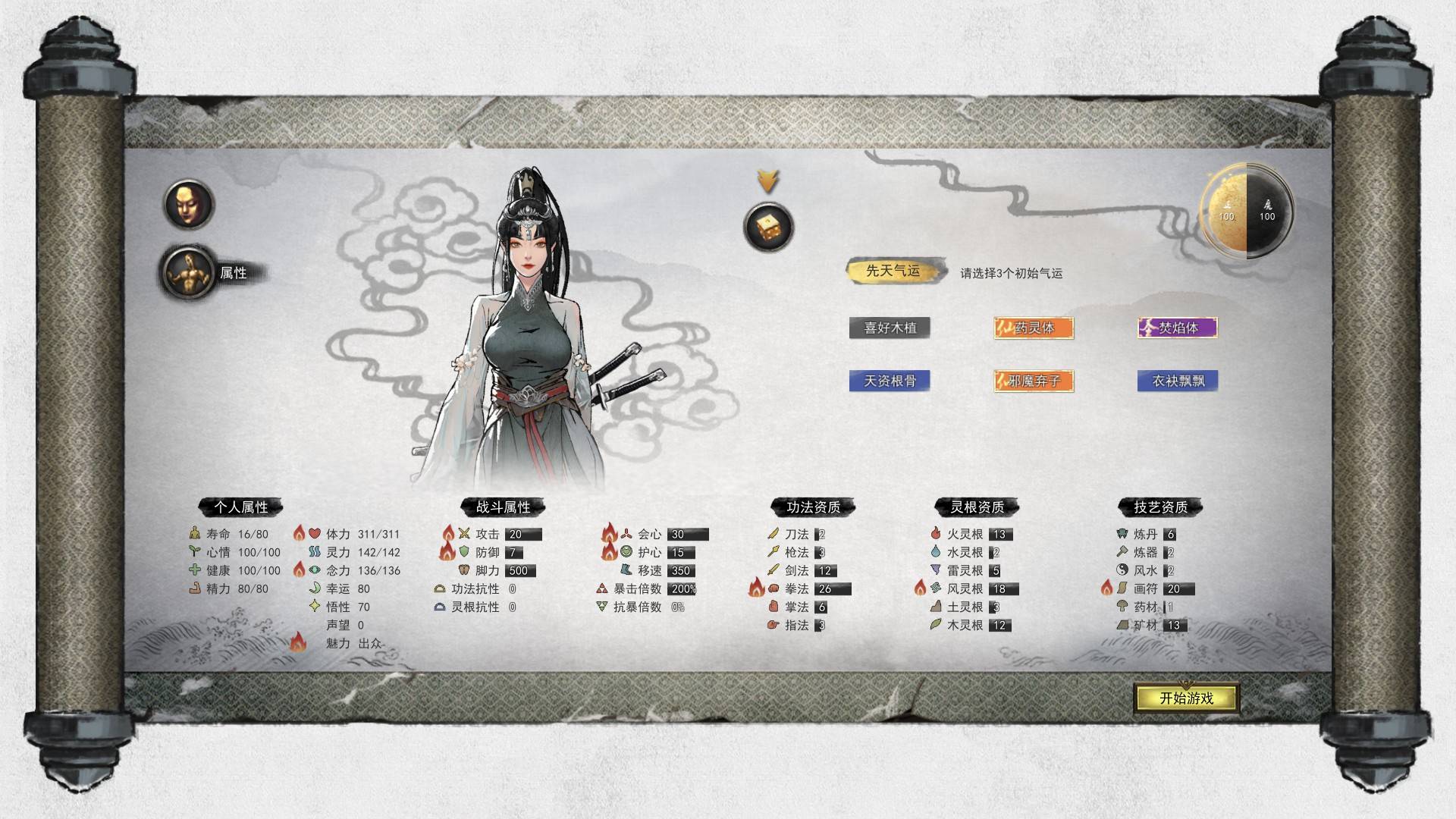 这些数值一部分由创建人物时玩家选择的随机出现的「先天气运」种类决定,比如「武器大师」可以让玩家的剑、刀、枪初始资质各加 20 点,枪法熟练度提升+30%,以此类推。建好人物之后,玩家也可以在冒险过程中各种灵果丹药来提升资质。