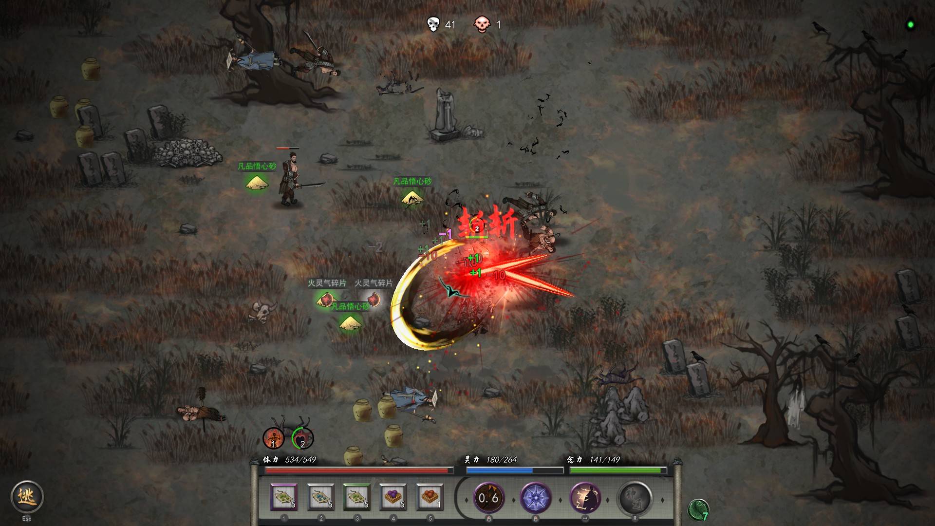 《鬼谷八荒》的战斗系统十分特殊,没有采用传统武侠、仙侠游戏常用的回合制或是走格子,而是将每一个小战场都做得像一局俯视视角的双摇杆射击游戏一样,只不过玩家控制的是仿佛从皮影戏里跳出来一般的僵硬人物,各种战斗特效酷炫至极,但仔细一看难免有种页游既视感。
